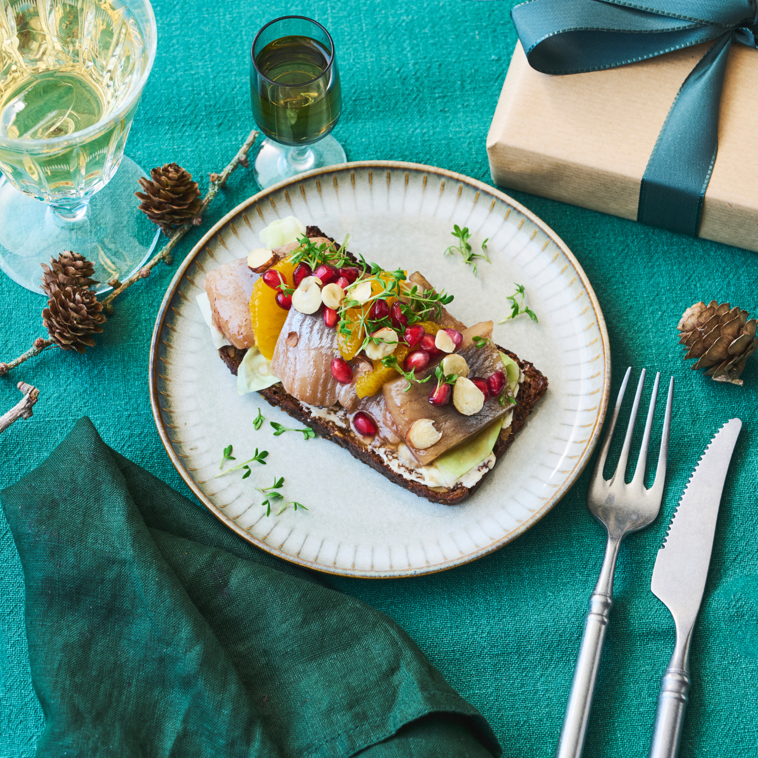 Sildebidderne placeres ovenpå en skive kål på det bløde rugbrød. Appelsinsalaten lægges ovenpå og der pyntes med ristede hasselnødder og frisk karse samt lidt af væden fra salaten.